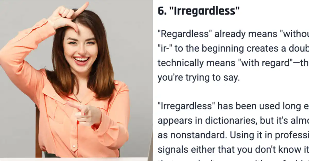 “Irregardless” has been used long enough that it appears in dictionaries, but it’s almost always flagged as nonstandard. Using it in professional contexts signals either that you don’t know it’s controversial or that you don’t care—neither of which helps your perceived intelligence.