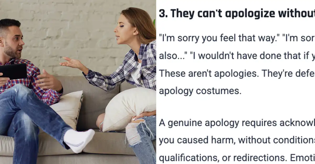 “I’m sorry you feel that way.” “I’m sorry, but you also…” “I wouldn’t have done that if you hadn’t…” These aren’t apologies. They’re defenses wearing apology costumes.
